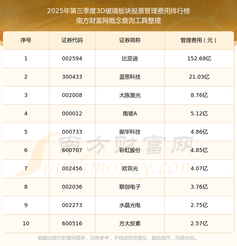 2025年第三季度,3D玻璃板塊股票管理費(fèi)用排名如下:比亞迪(002594)的管理費(fèi)用總額高達(dá)152.68億,藍(lán)思科技(300433)和大族激光(002008)位居第二和第三,南玻A(000012)、振華科技(000733)、彩虹股份(600707)、歐菲光(002456)、聯(lián)創(chuàng)電子(002036)、水晶光電(002273)、方大炭素(600516)分別進(jìn)入前十,其管理費(fèi)用總額分別排名第4-10名。