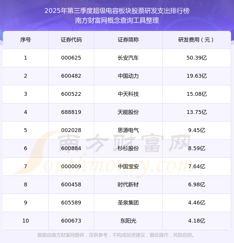 2025年第三季度,超級(jí)電容板塊股票研發(fā)支出排行榜中,長(zhǎng)安汽車(chē)(000625)研發(fā)支出總額高達(dá)50.39億,中國(guó)動(dòng)力(600482)和中天科技(600522)排名第二和第三,天能股份(688819)、思源電氣(002028)、杉杉股份(600884)、中國(guó)寶安(000009)、時(shí)代新材(600458)、圣泉集團(tuán)(605589)、東陽(yáng)光(600673)進(jìn)入前十,研發(fā)支出總額分別排名第4-10名。