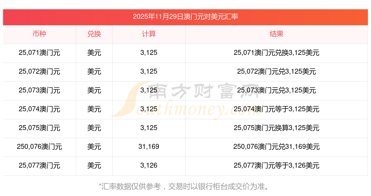 2025年11月29日匯率行情:31澳門元對美元匯率多少