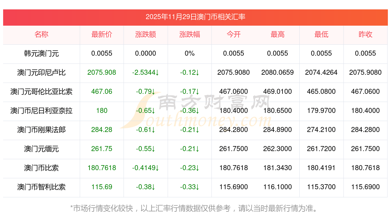 2025年11月29日澳門(mén)幣相關(guān)匯率查詢(xún)