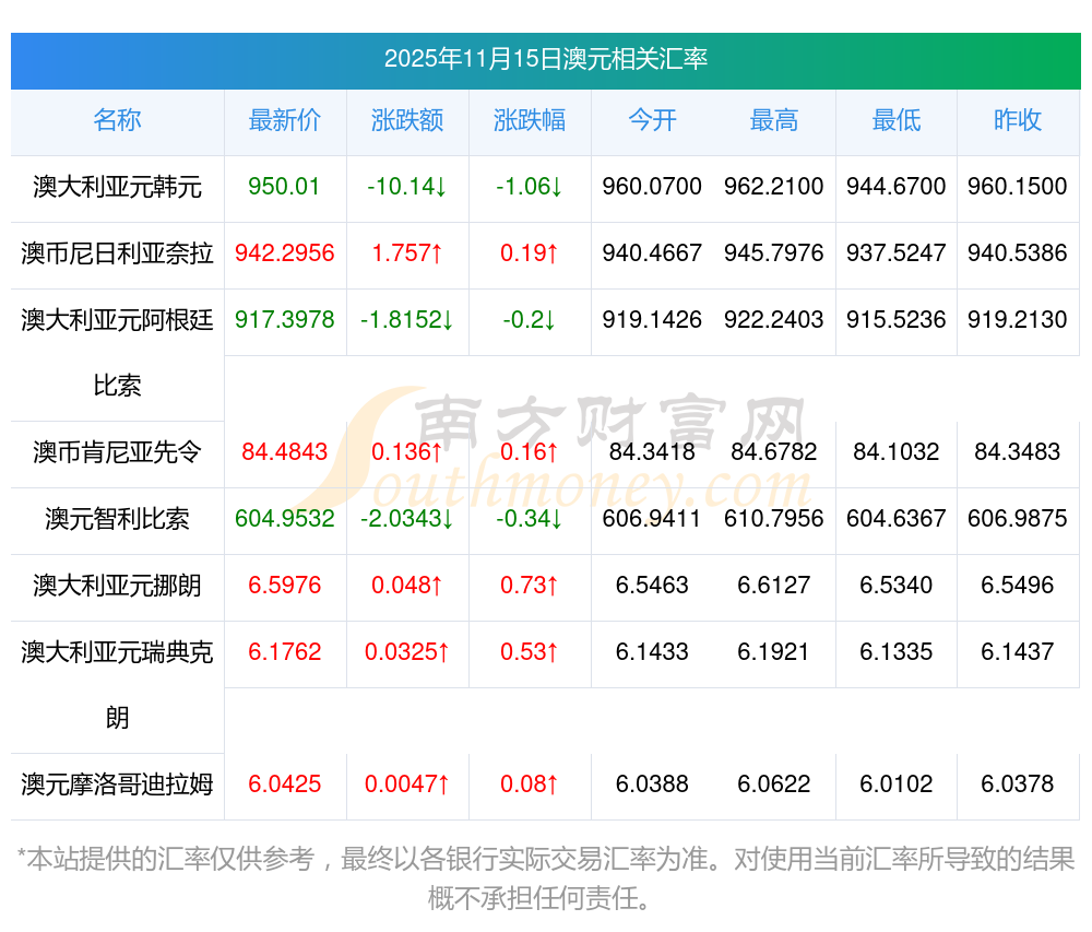 2025年11月15日最新消息,澳元兌換埃鎊最新匯率為30.854700,今開為30.8057,昨收為30.8547,最高為30.9231,最低為30.6965。
