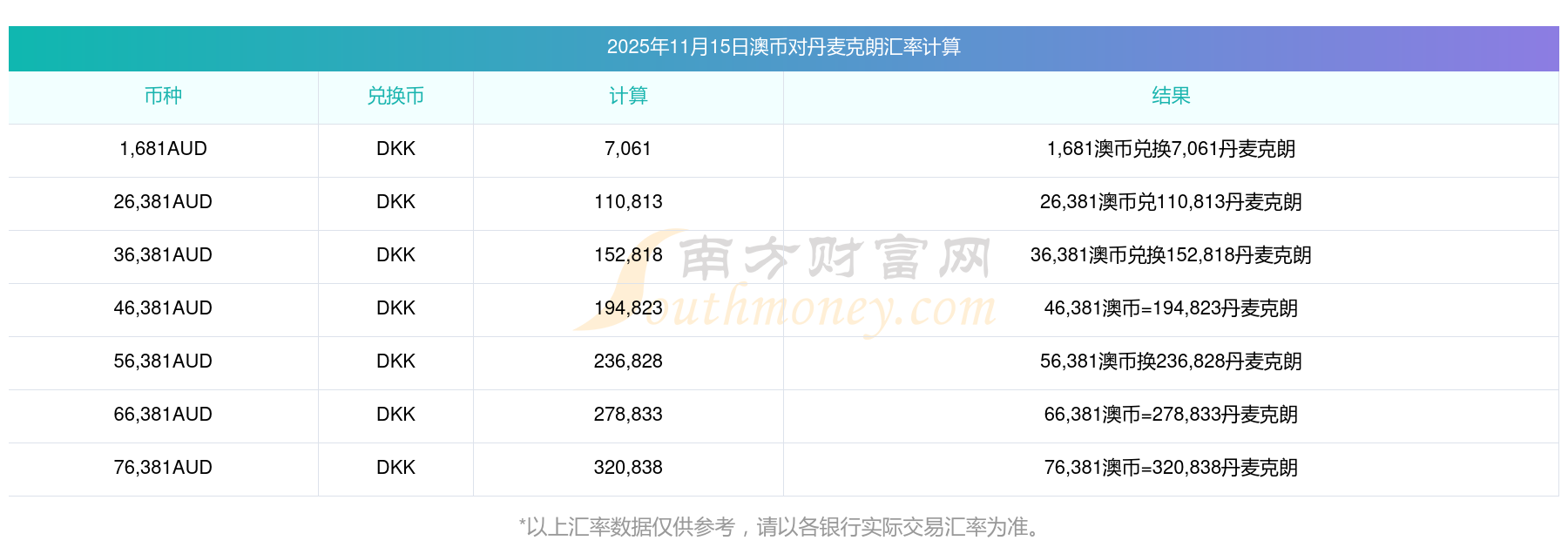今日匯率:澳幣兌丹麥克朗外匯行情(11-15)