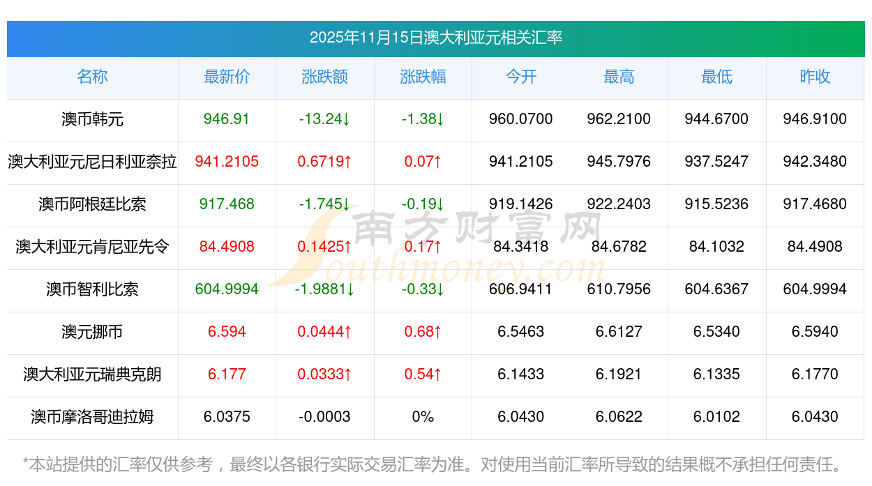 2025年11月15日澳大利亞元相關(guān)匯率查詢