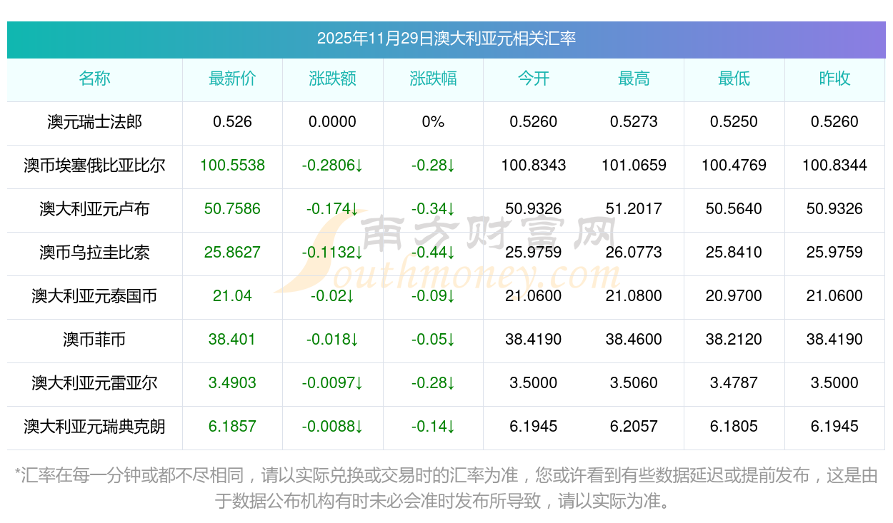 2025年11月29日澳大利亞元相關(guān)匯率查詢