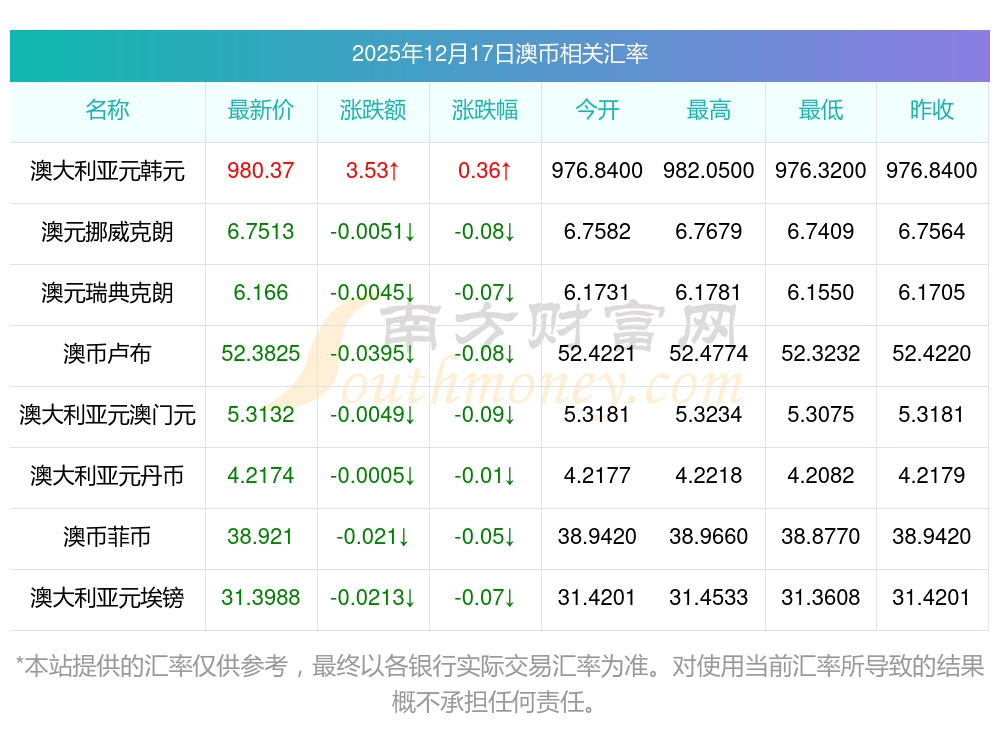 2025年12月17日澳幣相關(guān)匯率查詢