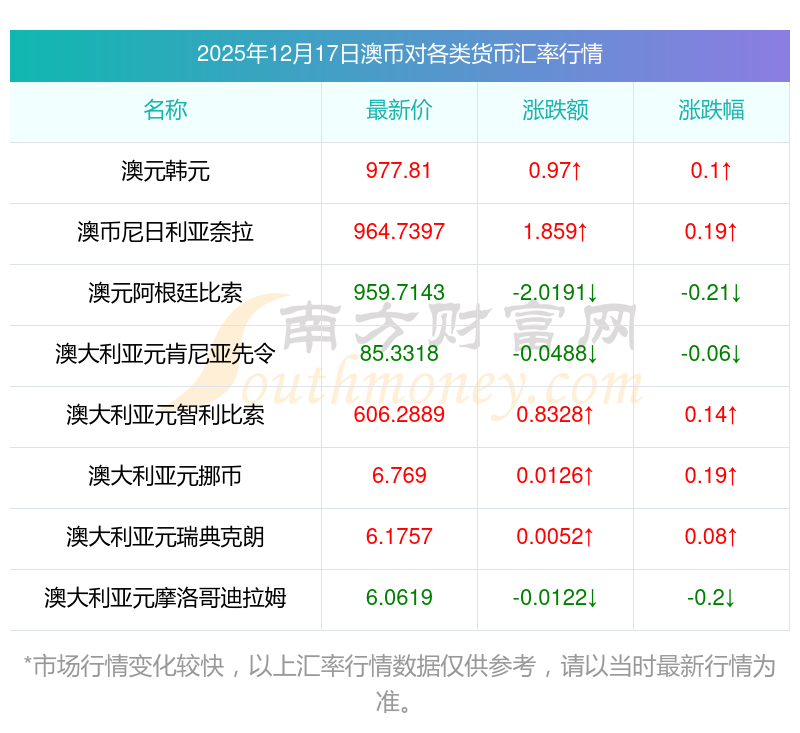 根據2025年12月17日匯率,澳幣兌換瑞郎匯率最新價0.526900,今開價0.5273,昨收價0.5274,最高價0.5289,最低價0.5263。
