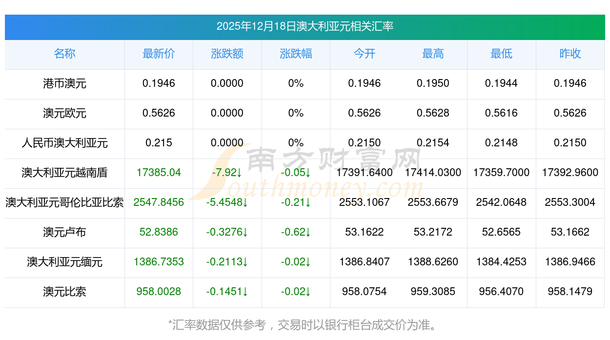 2025年12月18日澳大利亞元相關(guān)匯率查詢