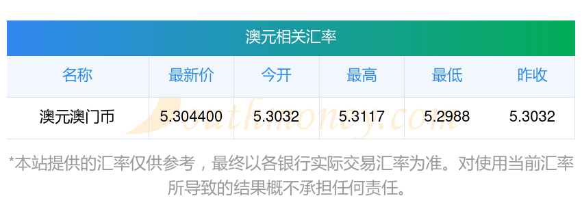 根據(jù)2025年12月19日匯率,澳元兌換澳門幣匯率最新價(jià)5.304400,今開價(jià)5.3032,昨收價(jià)5.3032,最高價(jià)5.3117,最低價(jià)5.2988。