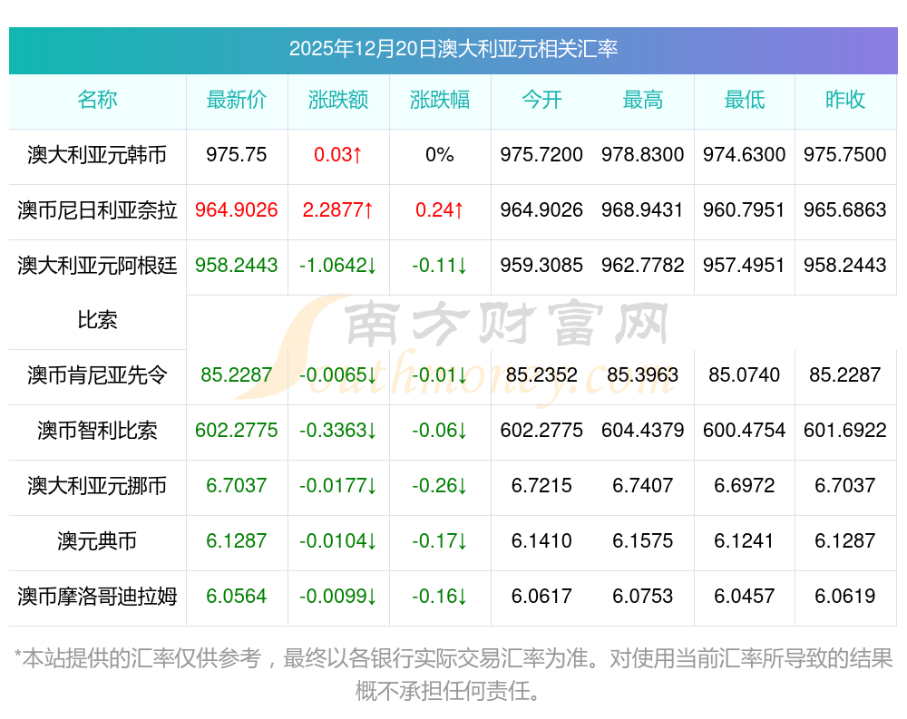 2025年12月20日澳大利亞元相關(guān)匯率查詢