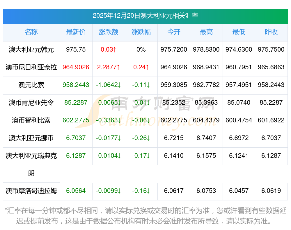 2025年12月20日澳大利亞元相關(guān)匯率查詢