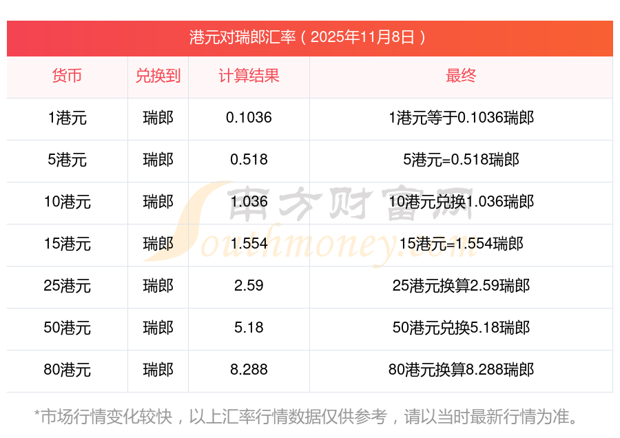 南方財富網(wǎng)為您提供港元對瑞郎匯率最新價格詳情。