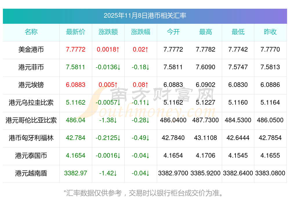 根據(jù)2025年11月8日匯率計算,港幣兌換加幣匯率最新價0.180700,今開價0.1807,昨收價0.1807,最高價0.1817,最低價0.1804。