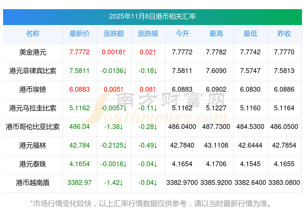 根據(jù)2025年11月8日匯率計算,HKD兌換CLP匯率最新價121.602900:今開價121.6069,昨收價121.6069,最高價122.0553,最低價121.2381。