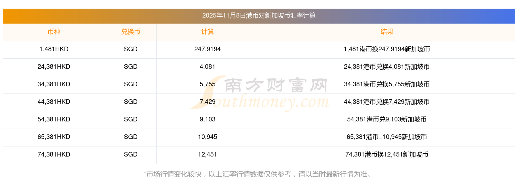 2025年11月8日港幣與新加坡幣的兌換匯率計(jì)算如下: