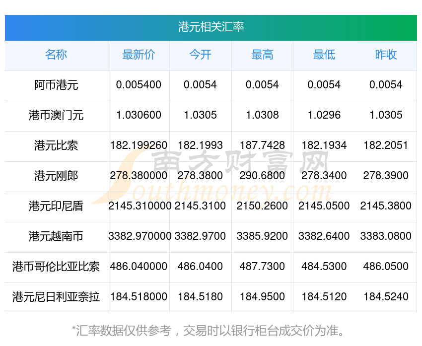 南方財富網(wǎng)為您提供港元對韓元匯率最新價格詳情。