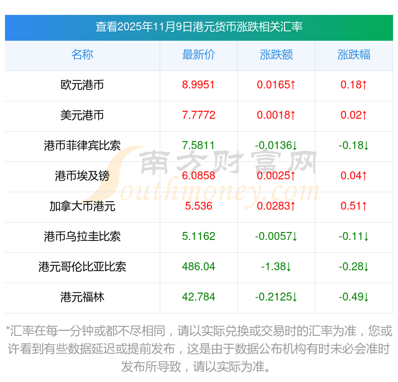 南方財富網為您提供港元對人民幣匯率最新價格詳情。