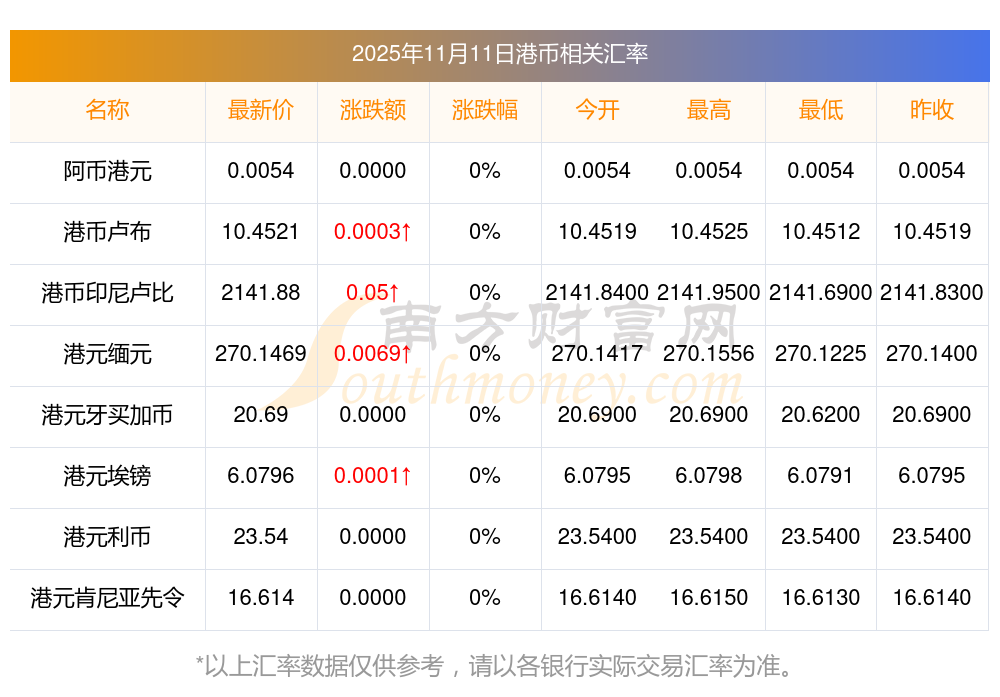 2025年11月11日港幣相關(guān)匯率查詢