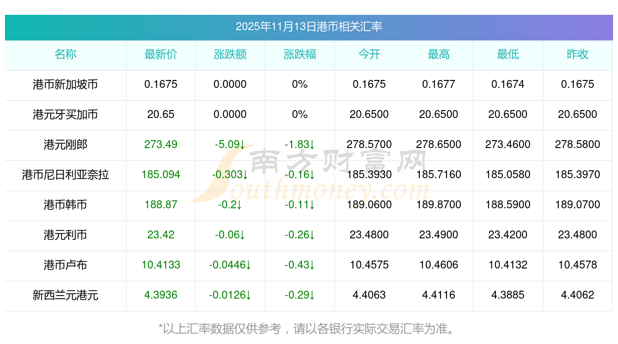 根據(jù)2025年11月13日匯率計(jì)算,港幣兌換菲幣匯率最新價(jià)7.605000,今開(kāi)價(jià)7.6074,昨收價(jià)7.6076,最高價(jià)7.6150,最低價(jià)7.6006。