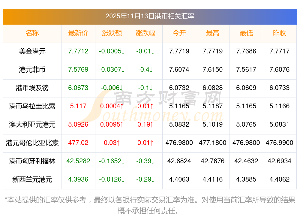 2025年11月13日港幣相關(guān)匯率查詢