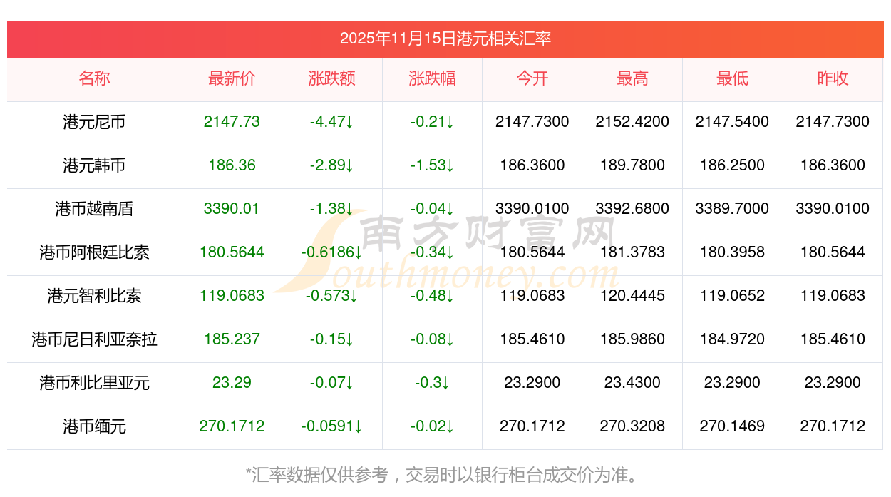 根據(jù)2025年11月15日匯率,港元兌換臺幣匯率最新價3.954700,今開價3.9547,昨收價3.9547,最高價4.0124,最低價3.9464。