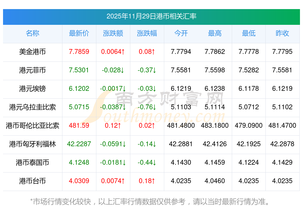 2025年11月29日港幣相關(guān)匯率查詢