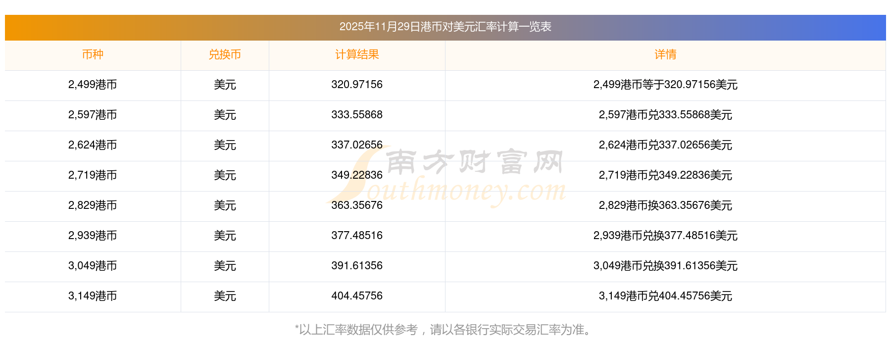 2025年11月29日匯率行情:5港幣對美元匯率多少