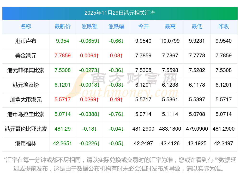 2025年11月29日港元相關(guān)匯率查詢
