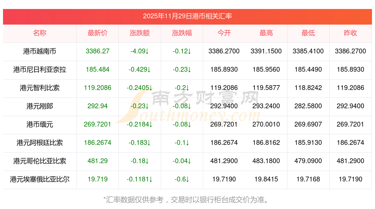 根據(jù)2025年11月29日匯率計算,HKD兌換EGP匯率最新價6.120100:今日開價6.1201,昨日收價6.1201,最高價6.1238,最低價6.1178。