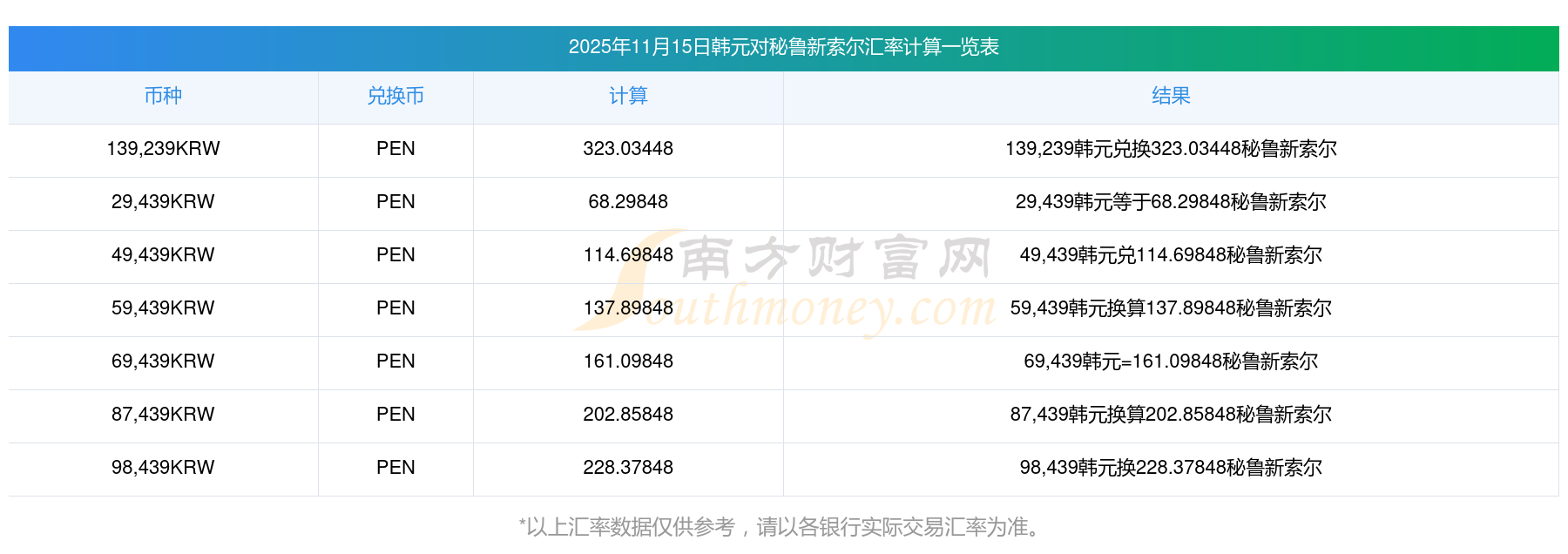 折算率多少?韓元對秘魯新索爾今日最新匯率查詢表?2025/11/15