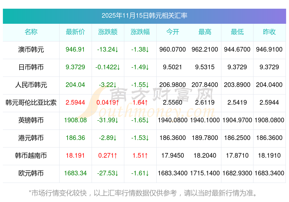 今天2韓元對巴西雷亞爾匯率是多少_新匯率行情(2025-11-15)