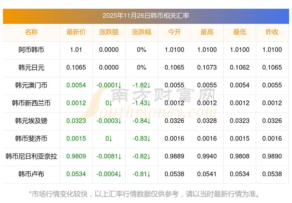 根據(jù)今天2025年11月26日匯率計(jì)算,KRW兌換CLP匯率最新價(jià)0.634997,今開價(jià)0.6385,昨收價(jià)0.6385,最高價(jià)0.6421,最低價(jià)0.6340。