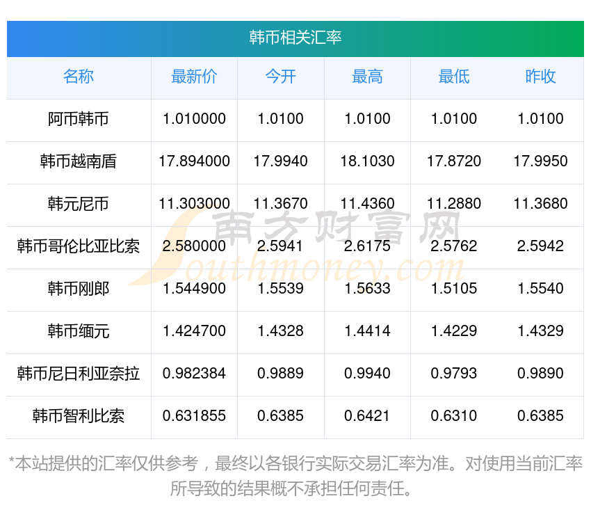 南方財富網(wǎng)為您提供韓幣對利比里亞元匯率最新價格詳情。
