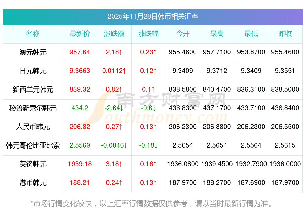 根據(jù)2025年11月28日匯率計算,KRW兌換LRD匯率最新價0.121200,今開價0.1216,昨收價0.1214,最高價0.1216,最低價0.1211。