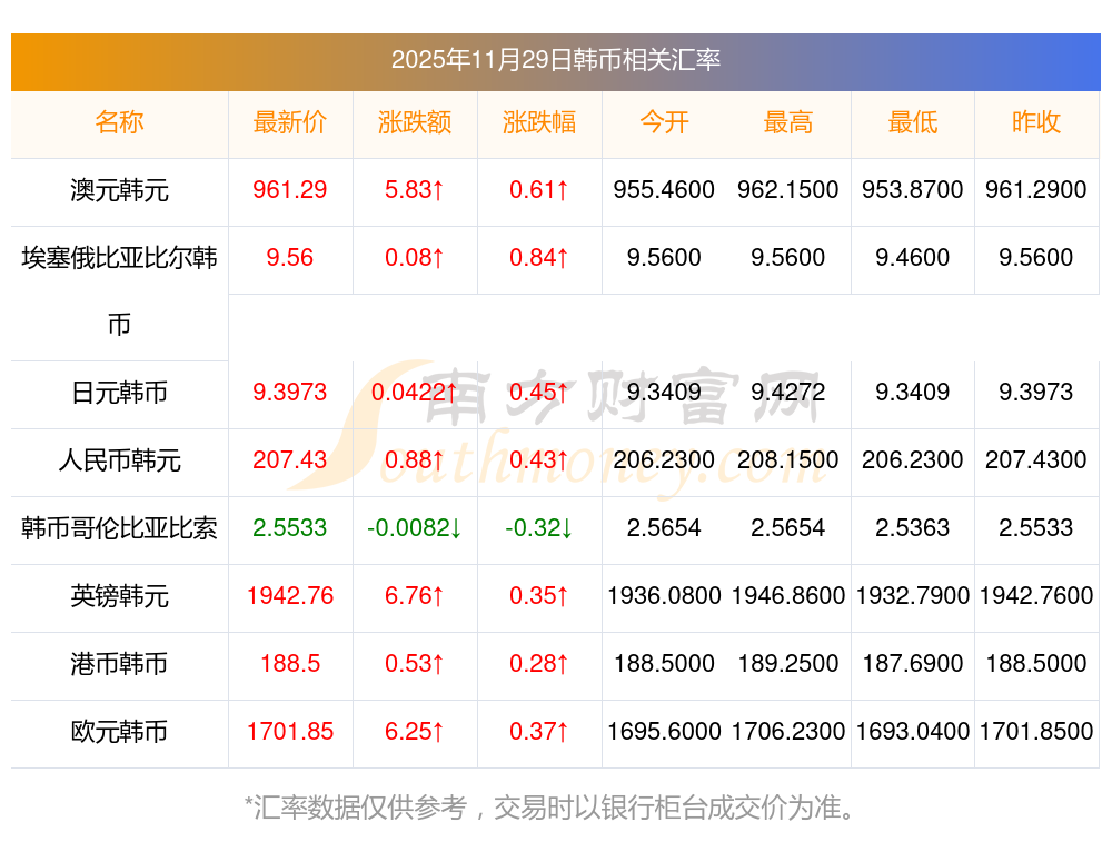 根據(jù)2025年11月29日匯率,韓幣兌換匈幣匯率最新價0.224220,今開價0.2242,昨收價0.2241,最高價0.2253,最低價0.2236。