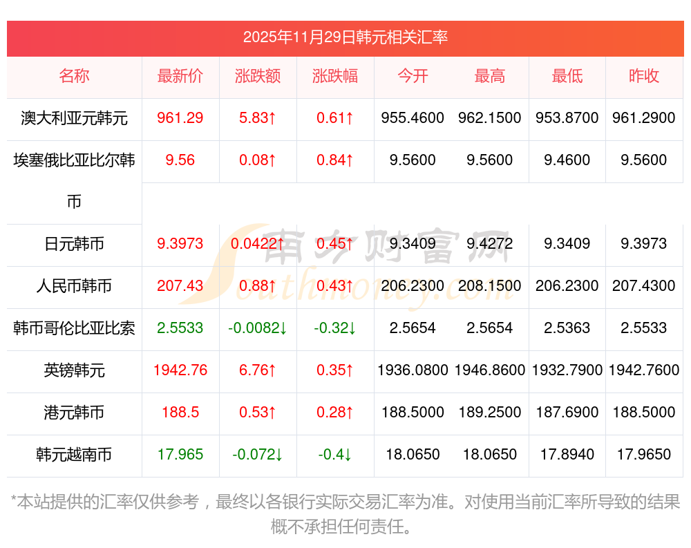 2025年11月29日韓元相關(guān)匯率查詢