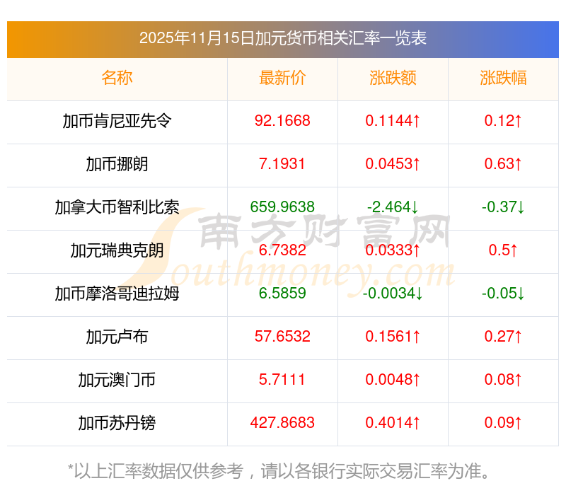 根據(jù)2025年11月15日匯率,加元兌換埃及鎊匯率最新33.657800,今開33.6578,昨收33.6578,最高33.6794,最低33.5980。