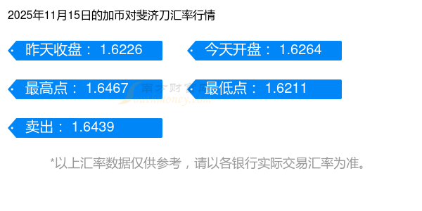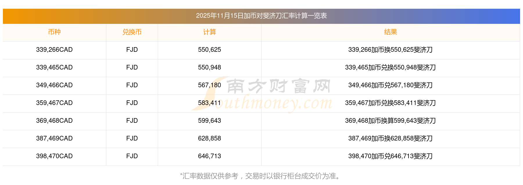 今日加幣匯價(jià):2025年11月15日20加幣兌斐濟(jì)刀匯價(jià)一覽表