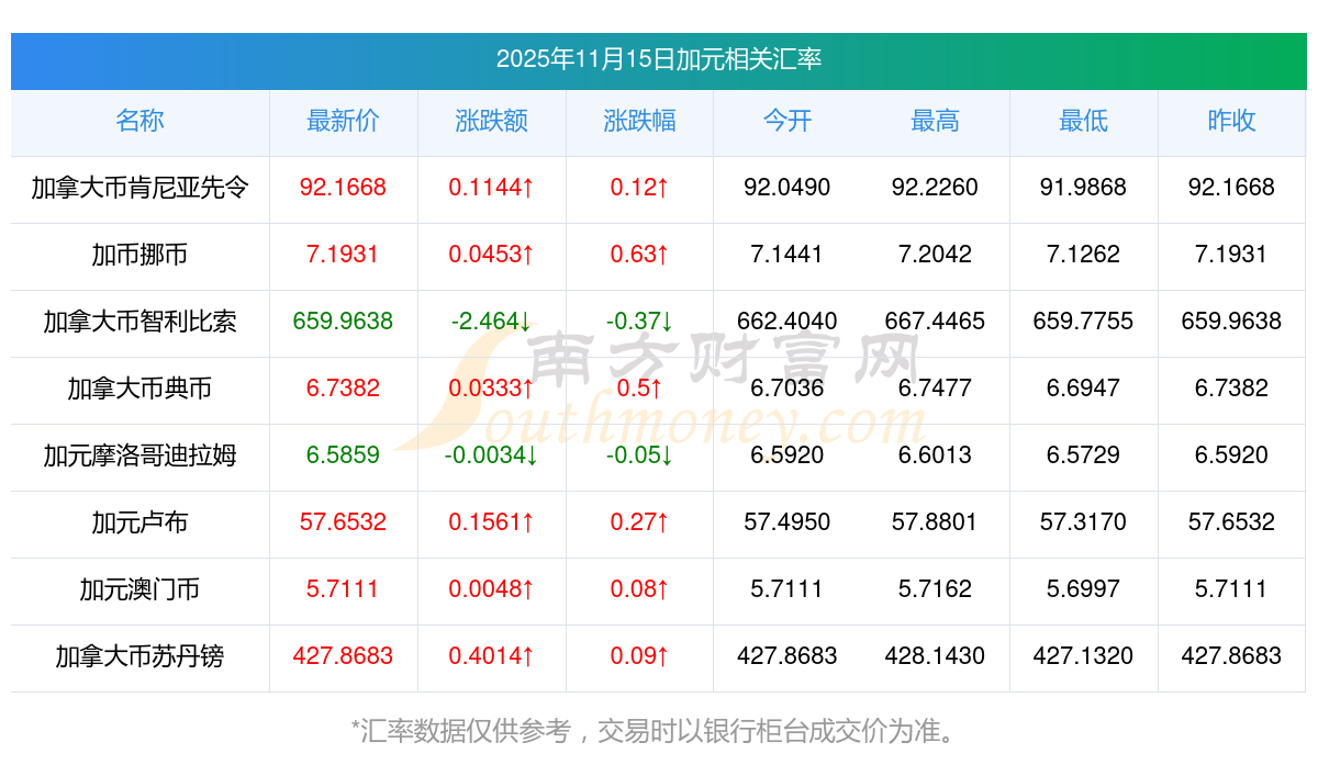根據(jù)2025年11月15日匯率計算,CAD兌換JMD匯率最新價114.390000:今日開價114.3900,昨日收價114.6000,最高價114.6700,最低價114.3000。