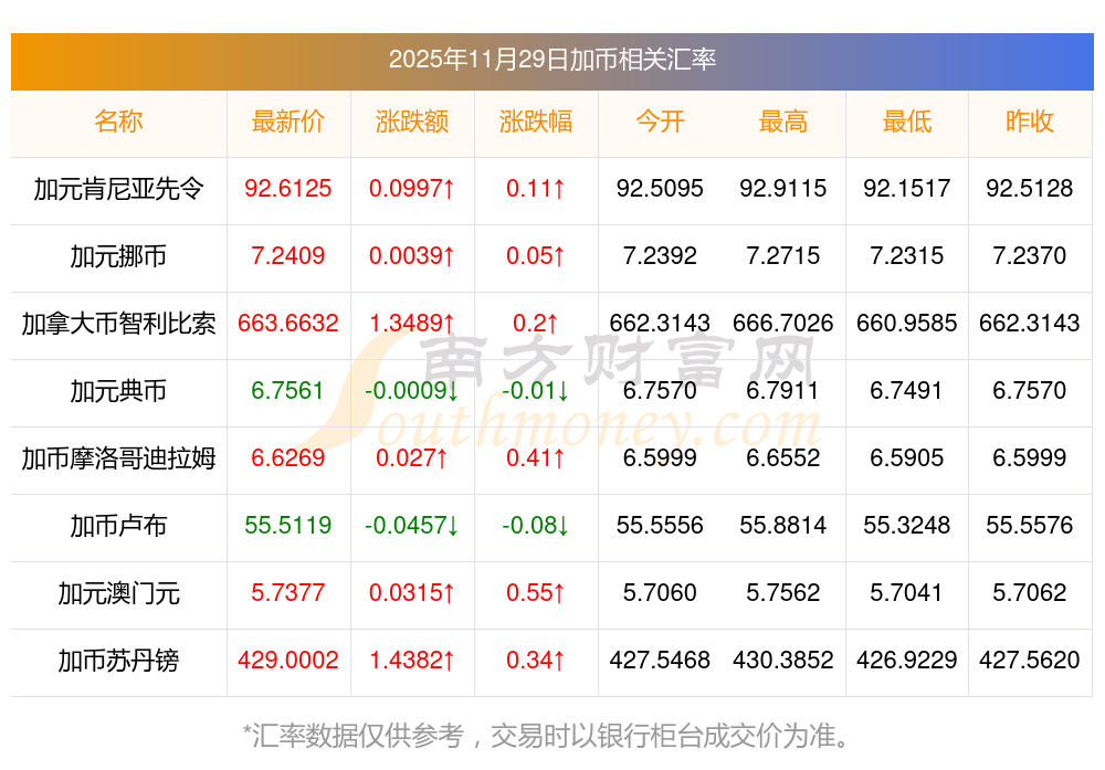 2025年11月29日最新消息,加幣兌換瑞郎最新匯率為0.574800,今開(kāi)為0.5737,昨收為0.5737,最高為0.5768,最低為0.5731。