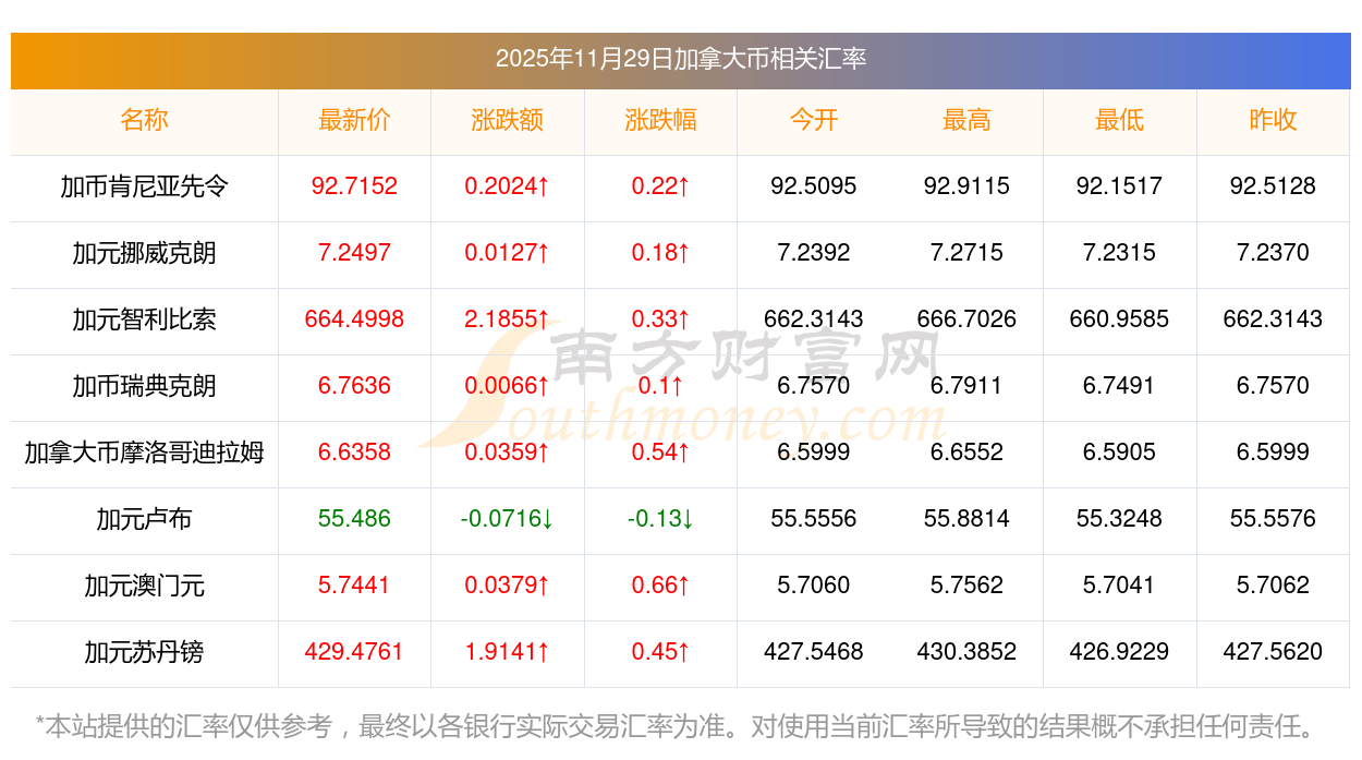 2025年11月29日加拿大幣相關(guān)匯率查詢