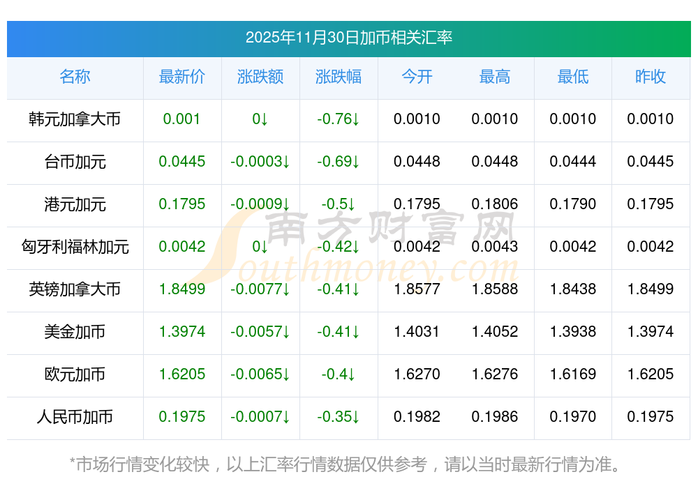 2025年11月30日加幣相關匯率查詢