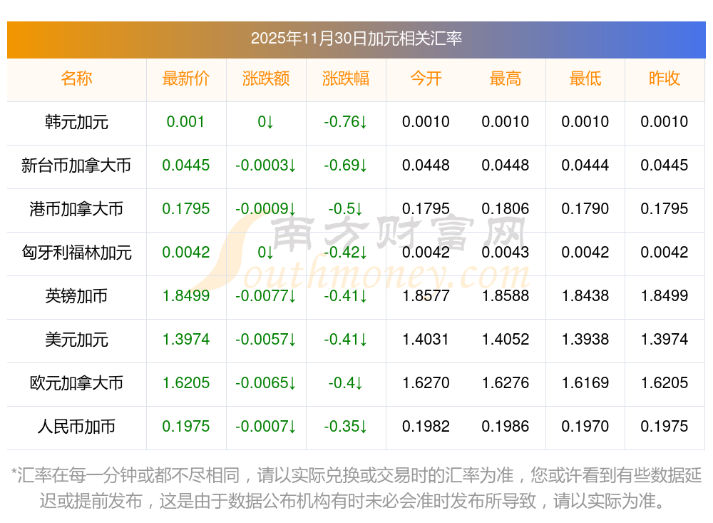 根據(jù)2025年11月30日匯率,加元兌換波幣匯率最新價2.614300,今開價2.5999,昨收價2.6143,最高價2.6193,最低價2.5982。