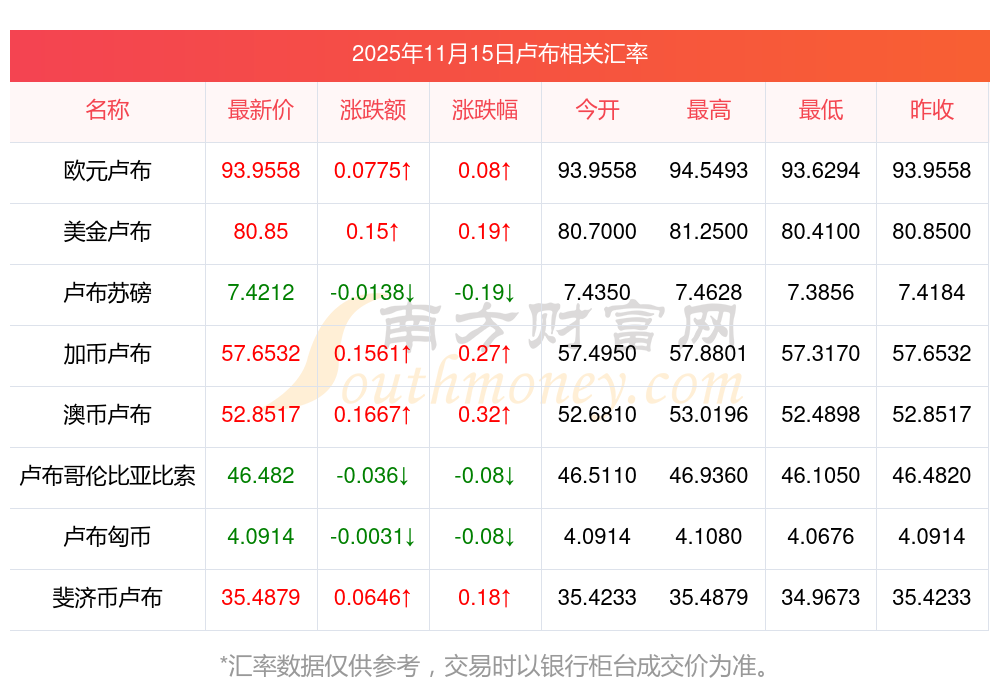 2025年11月15日盧布相關(guān)匯率查詢(xún)