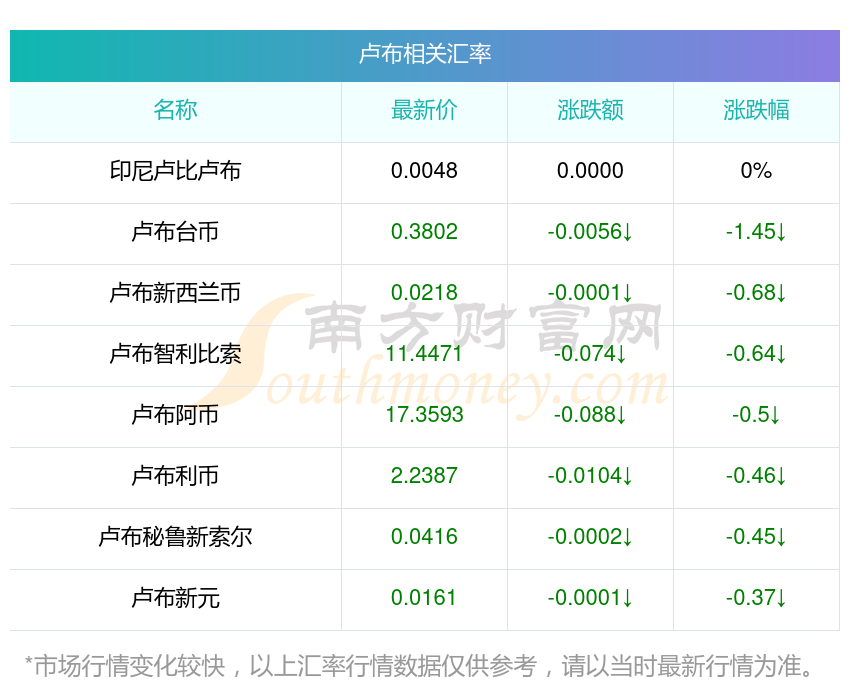 南方財富網(wǎng)為您提供盧布對人民幣匯率最新價格詳情。