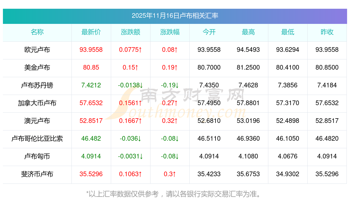 2025年11月16日盧布相關(guān)匯率查詢(xún)