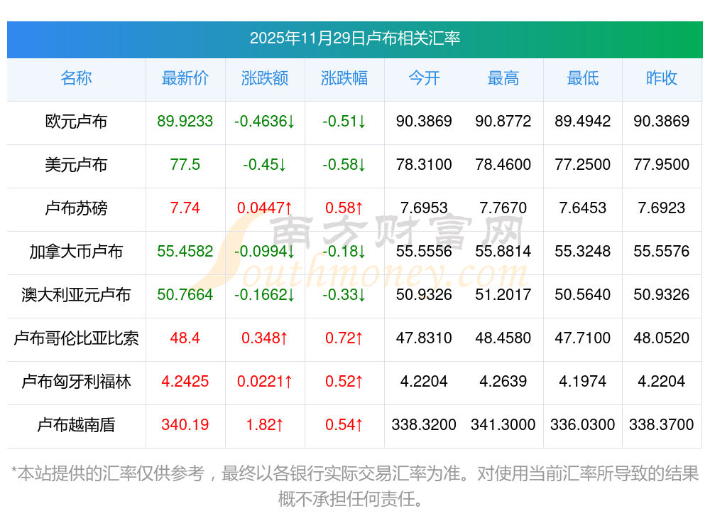 2025年11月29日盧布相關(guān)匯率查詢