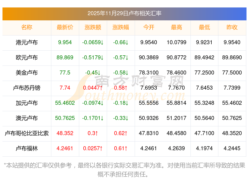 2025年11月29日最新消息,盧布兌換日元最新匯率為2.015200,今開為2.0051,昨收為2.0152,最高為2.0239,最低為1.9915。