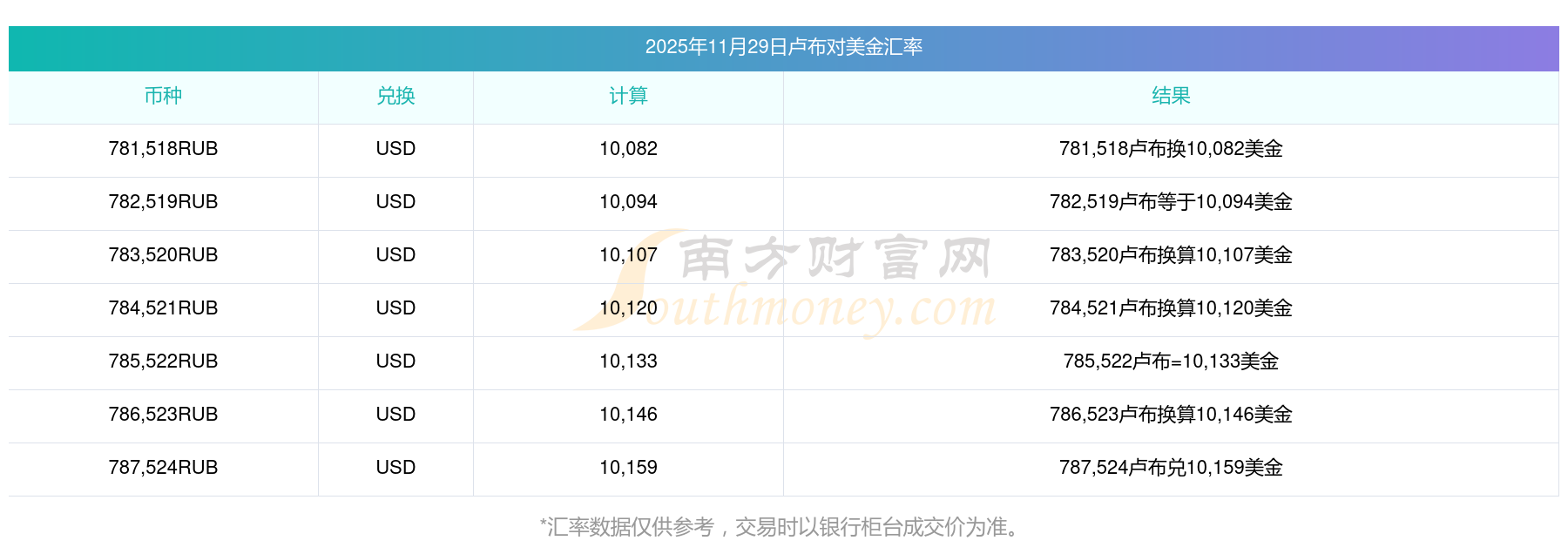 南方財富網(wǎng)為您提供盧布對美金匯率最新價格詳情。