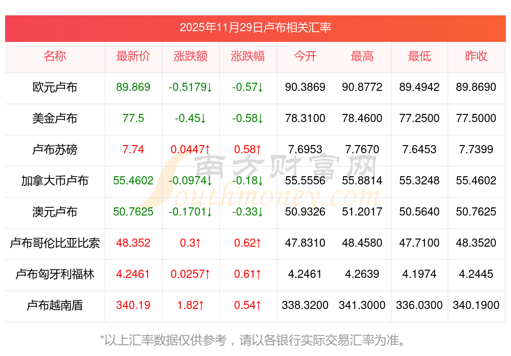 根據(jù)2025年11月29日匯率計(jì)算,RUB兌換CUP匯率最新價(jià)0.309674:今開價(jià)0.3079,昨收價(jià)0.3097,最高價(jià)0.3107,最低價(jià)0.3059。