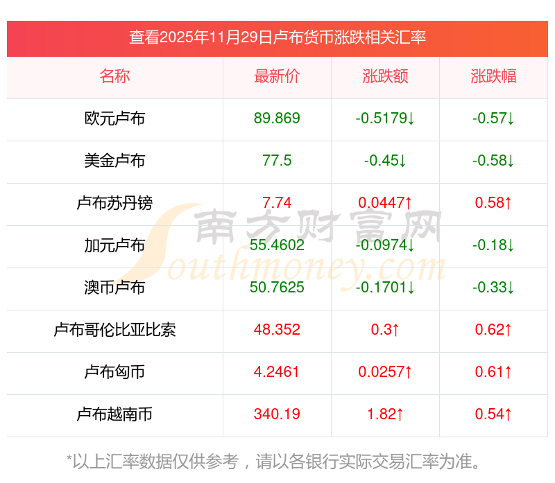 根據(jù)2025年11月29日匯率,盧布兌換菲律賓比索匯率最新價0.756600,今開價0.7540,昨收價0.7566,最高價0.7593,最低價0.7471。